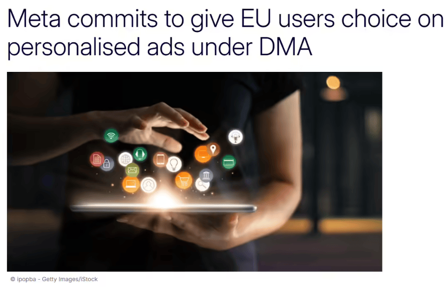 欧盟委员会表示,认可Meta承诺为欧盟用户提供Facebook和Instagram服务的替代方案,该方案将向用户展示个性化程度较低的广告,以符合DMA的要求。