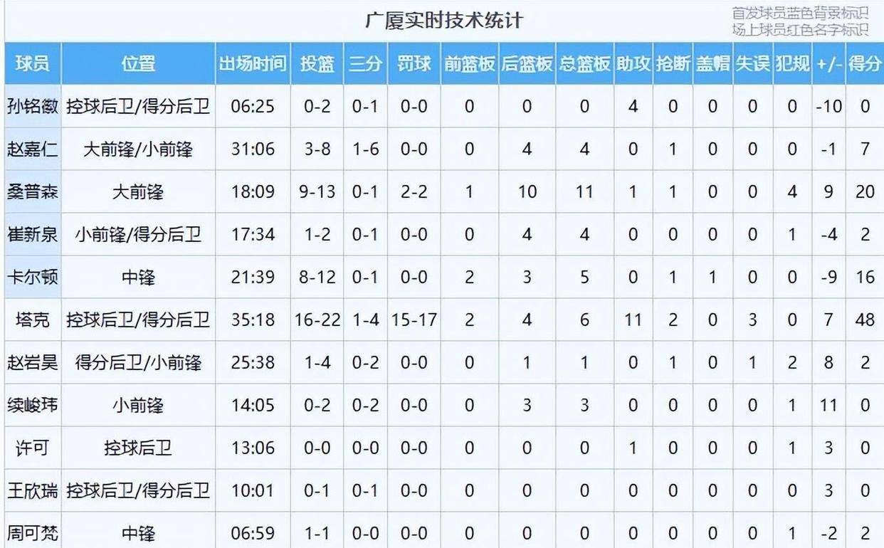 这场比赛的数据也透着古怪,广厦队几乎靠外援打天下,塔克一人就轰下48分11助攻,桑普森20分11篮板。